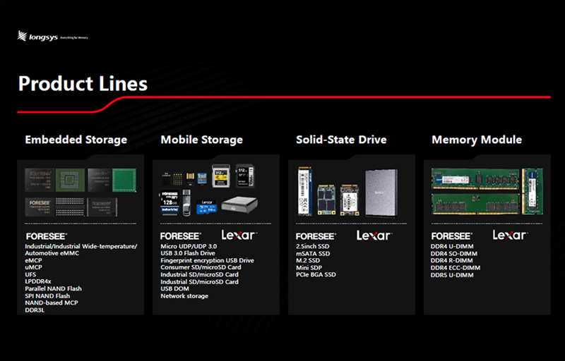 eMMCやeMCP、UFS、LPDDR、uMCPなど幅広いランナップを持ち、スマートフォンやタブレット、TV、STB等の分野で広く採用されています。特許技術を用いた自社開発ファームウェアと、厳しい検証テストの実施により、システムの安定運用とデータの信頼性を保証します。